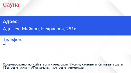 Сауна по адресу Адыгея, Майкоп, Некрасова, 291в в дальнейшем Организация, размещена в следующих категориях: