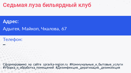 Седьмая луза, бильярдный клуб по адресу Адыгея, Майкоп, Чкалова, 67 в дальнейшем Организация, размещена в следующих категориях: