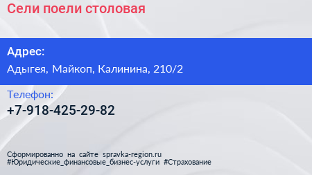 Сели-поели, столовая по адресу Адыгея, Майкоп, Калинина, 210/2 в дальнейшем Организация, размещена в следующих категориях: