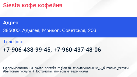 Siesta кофе, кофейня по адресу 385000, Адыгея, Майкоп, Советская, 203 в дальнейшем Организация, размещена в следующих категориях: