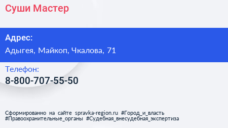 Суши Мастер по адресу Адыгея, Майкоп, Чкалова, 71 в дальнейшем Организация, размещена в следующих категориях: