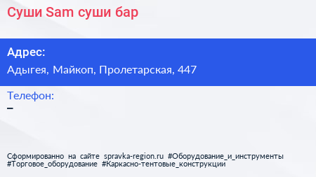 Суши Sam, суши-бар по адресу Адыгея, Майкоп, Пролетарская, 447 в дальнейшем Организация, размещена в следующих категориях: