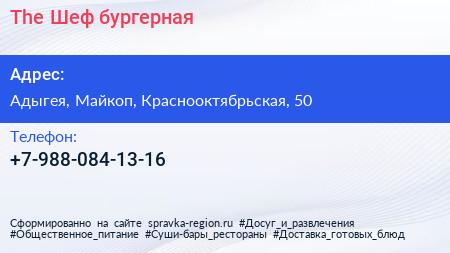 The Шеф, бургерная по адресу Адыгея, Майкоп, Краснооктябрьская, 50 в дальнейшем Организация, размещена в следующих категориях: