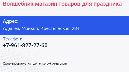 Волшебник, магазин товаров для праздника по адресу Адыгея, Майкоп, Крестьянская, 234 в дальнейшем Организация, размещена в следующих категориях: