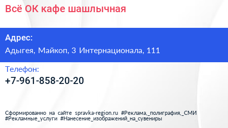 Всё ОК, кафе-шашлычная по адресу Адыгея, Майкоп, 3 Интернационала, 111 в дальнейшем Организация, размещена в следующих категориях: