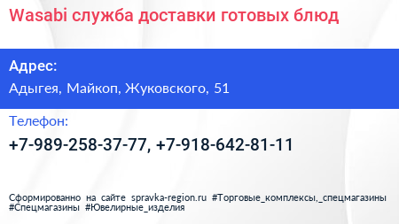 Wasabi, служба доставки готовых блюд по адресу Адыгея, Майкоп, Жуковского, 51 в дальнейшем Организация, размещена в следующих категориях: