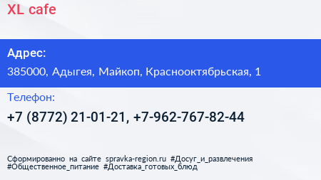 XL cafe по адресу 385000, Адыгея, Майкоп, Краснооктябрьская, 1 в дальнейшем Организация, размещена в следующих категориях: