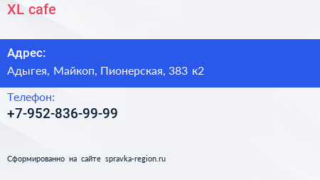 XL cafe по адресу Адыгея, Майкоп, Пионерская, 383 к2 в дальнейшем Организация, размещена в следующих категориях: