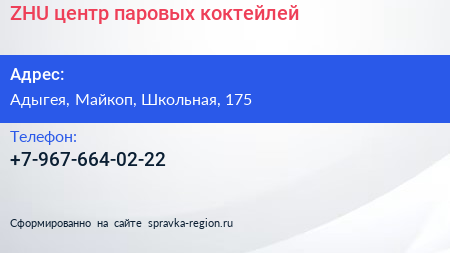 ZHU, центр паровых коктейлей по адресу Адыгея, Майкоп, Школьная, 175 в дальнейшем Организация, размещена в следующих категориях: