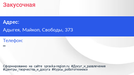 Закусочная по адресу Адыгея, Майкоп, Свободы, 373 в дальнейшем Организация, размещена в следующих категориях: