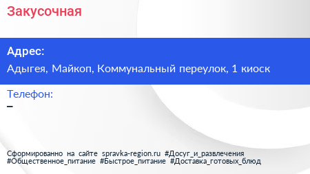 Закусочная по адресу Адыгея, Майкоп, Коммунальный переулок, 1 киоск в дальнейшем Организация, размещена в следующих категориях: