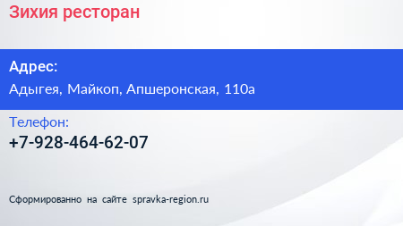 Зихия, ресторан по адресу Адыгея, Майкоп, Апшеронская, 110а в дальнейшем Организация, размещена в следующих категориях: