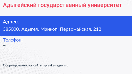 Адыгейский государственный университет по адресу 385000, Адыгея, Майкоп, Первомайская, 212 в дальнейшем Организация, размещена в следующих категориях: