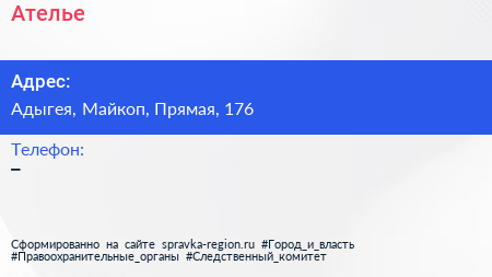 Ателье по адресу Адыгея, Майкоп, Прямая, 176 в дальнейшем Организация, размещена в следующих категориях: