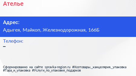 Ателье по адресу Адыгея, Майкоп, Железнодорожная, 166Б в дальнейшем Организация, размещена в следующих категориях: