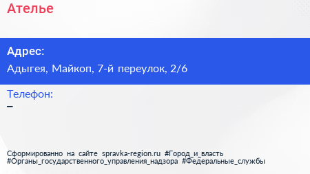 Ателье по адресу Адыгея, Майкоп, 7-й переулок, 2/6 в дальнейшем Организация, размещена в следующих категориях: