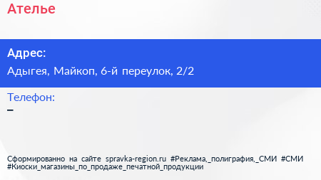 Ателье по адресу Адыгея, Майкоп, 6-й переулок, 2/2 в дальнейшем Организация, размещена в следующих категориях: