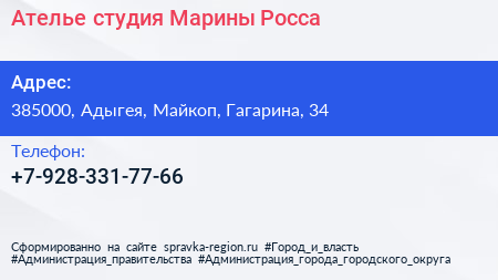 Ателье-студия Марины Росса по адресу 385000, Адыгея, Майкоп, Гагарина, 34 в дальнейшем Организация, размещена в следующих категориях: