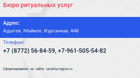 Бюро ритуальных услуг по адресу Адыгея, Майкоп, Курганная, 448 в дальнейшем Организация, размещена в следующих категориях:
