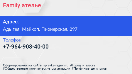 Family, ателье по адресу Адыгея, Майкоп, Пионерская, 297 в дальнейшем Организация, размещена в следующих категориях: