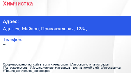 Химчистка по адресу Адыгея, Майкоп, Привокзальная, 128д в дальнейшем Организация, размещена в следующих категориях:
