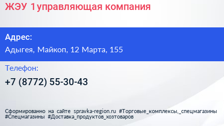 ЖЭУ №1, управляющая компания по адресу Адыгея, Майкоп, 12 Марта, 155 в дальнейшем Организация, размещена в следующих категориях: