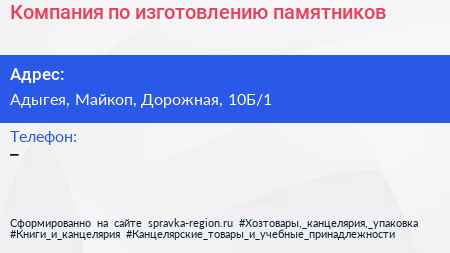 Компания по изготовлению памятников по адресу Адыгея, Майкоп, Дорожная, 10Б/1 в дальнейшем Организация, размещена в следующих категориях: