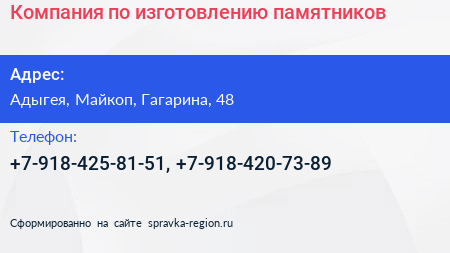 Компания по изготовлению памятников по адресу Адыгея, Майкоп, Гагарина, 48 в дальнейшем Организация, размещена в следующих категориях: