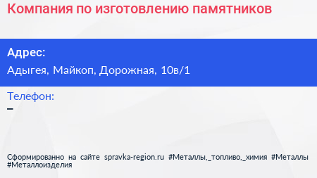 Компания по изготовлению памятников по адресу Адыгея, Майкоп, Дорожная, 10в/1 в дальнейшем Организация, размещена в следующих категориях: