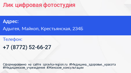 Лик, цифровая фотостудия по адресу Адыгея, Майкоп, Крестьянская, 234Б в дальнейшем Организация, размещена в следующих категориях: