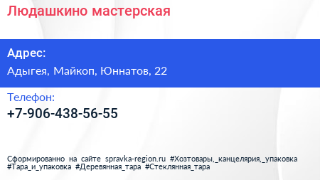 Людашкино, мастерская по адресу Адыгея, Майкоп, Юннатов, 22 в дальнейшем Организация, размещена в следующих категориях: