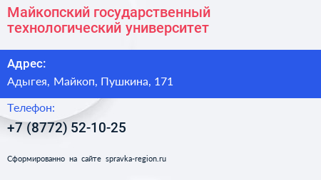 Майкопский государственный технологический университет по адресу Адыгея, Майкоп, Пушкина, 171 в дальнейшем Организация, размещена в следующих категориях: