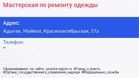 Мастерская по ремонту одежды по адресу Адыгея, Майкоп, Краснооктябрьская, 57а в дальнейшем Организация, размещена в следующих категориях: