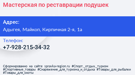 Мастерская по реставрации подушек по адресу Адыгея, Майкоп, Кирпичная 2-я, 1а в дальнейшем Организация, размещена в следующих категориях: