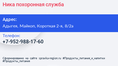 Ника, похоронная служба по адресу Адыгея, Майкоп, Короткая 2-я, 8/2а в дальнейшем Организация, размещена в следующих категориях: