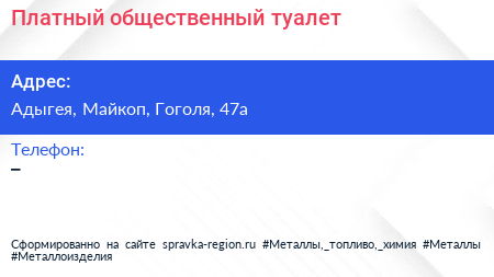 Платный общественный туалет по адресу Адыгея, Майкоп, Гоголя, 47а в дальнейшем Организация, размещена в следующих категориях: