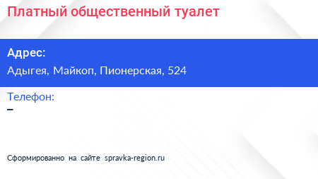Платный общественный туалет по адресу Адыгея, Майкоп, Пионерская, 524 в дальнейшем Организация, размещена в следующих категориях: