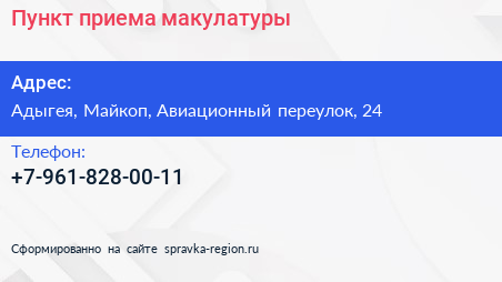 Пункт приема макулатуры по адресу Адыгея, Майкоп, Авиационный переулок, 24 в дальнейшем Организация, размещена в следующих категориях:
