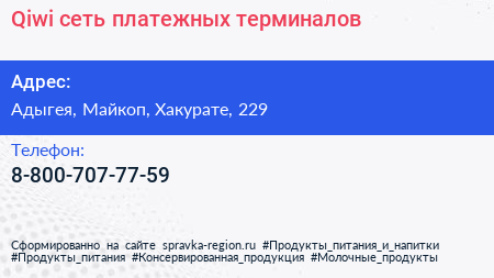 Qiwi, сеть платежных терминалов по адресу Адыгея, Майкоп, Хакурате, 229 в дальнейшем Организация, размещена в следующих категориях: