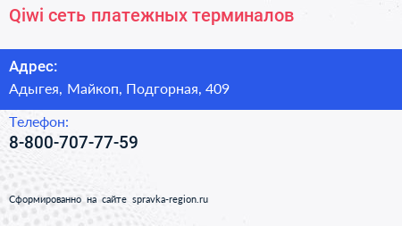 Qiwi, сеть платежных терминалов по адресу Адыгея, Майкоп, Подгорная, 409 в дальнейшем Организация, размещена в следующих категориях: