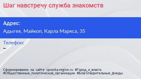 Шаг навстречу, служба знакомств по адресу Адыгея, Майкоп, Карла Маркса, 35 в дальнейшем Организация, размещена в следующих категориях: