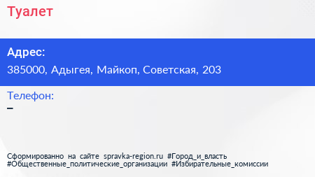 Туалет по адресу 385000, Адыгея, Майкоп, Советская, 203 в дальнейшем Организация, размещена в следующих категориях: