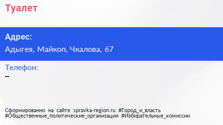 Туалет по адресу Адыгея, Майкоп, Чкалова, 67 в дальнейшем Организация, размещена в следующих категориях: