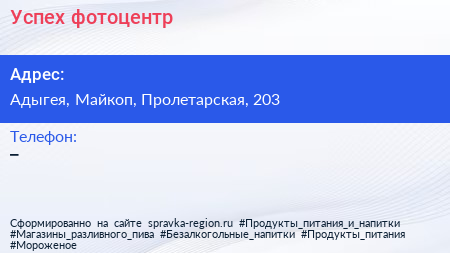 Успех, фотоцентр по адресу Адыгея, Майкоп, Пролетарская, 203 в дальнейшем Организация, размещена в следующих категориях: