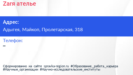 Zarя, ателье по адресу Адыгея, Майкоп, Пролетарская, 318 в дальнейшем Организация, размещена в следующих категориях: