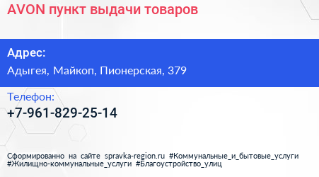 AVON, пункт выдачи товаров по адресу Адыгея, Майкоп, Пионерская, 379 в дальнейшем Организация, размещена в следующих категориях: