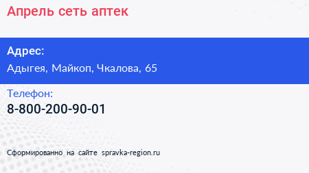 Апрель, сеть аптек по адресу Адыгея, Майкоп, Чкалова, 65 в дальнейшем Организация, размещена в следующих категориях: