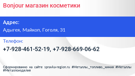Bonjour, магазин косметики по адресу Адыгея, Майкоп, Гоголя, 31 в дальнейшем Организация, размещена в следующих категориях: