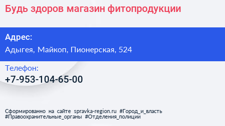Будь здоров!, магазин фитопродукции по адресу Адыгея, Майкоп, Пионерская, 524 в дальнейшем Организация, размещена в следующих категориях: