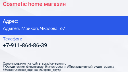 Cosmetic home, магазин по адресу Адыгея, Майкоп, Чкалова, 67 в дальнейшем Организация, размещена в следующих категориях: